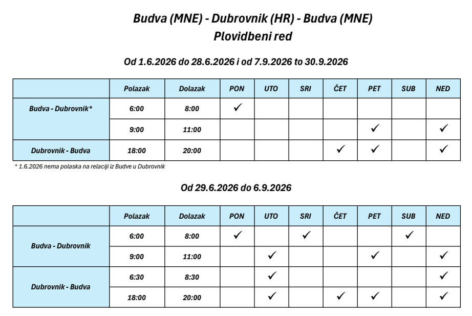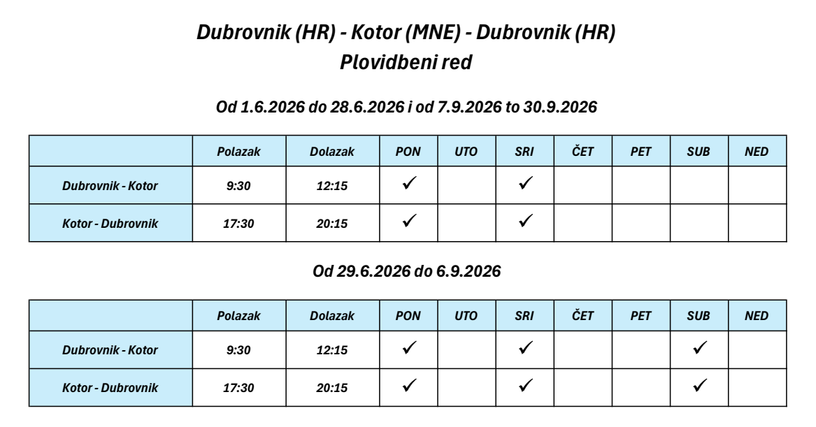 Red plovidbe brodske linije Dubrovnik - Crna Gora