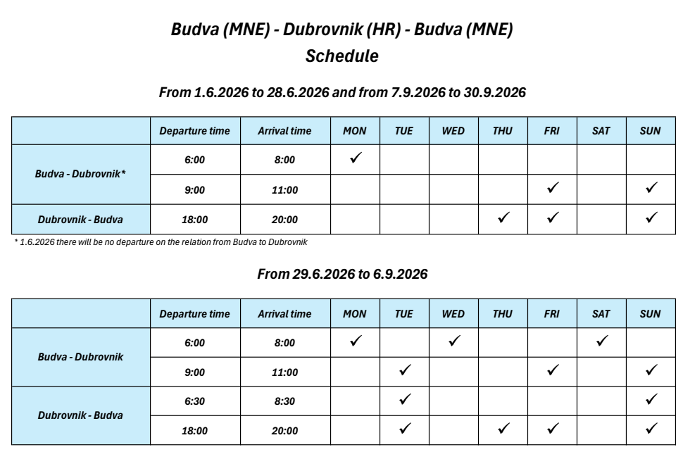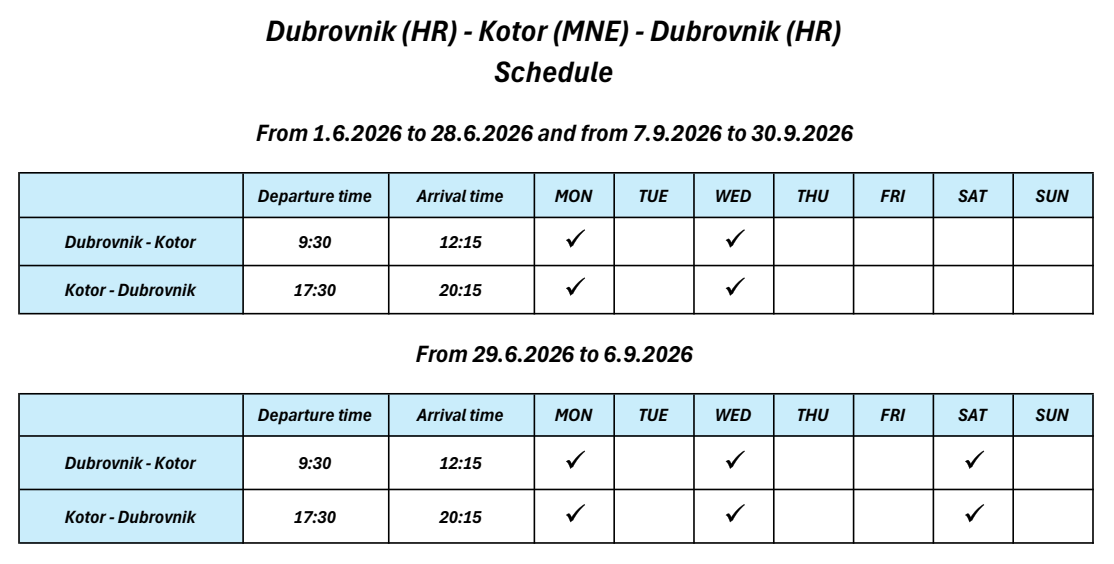 Fast ferry connections from Dubrovnik to Budva and Kotor in Montenegro provide a convenient option for day trips or one-way travel, allowing you to skip road traffic and border crossings. Choose your route below to view the full timetable.
