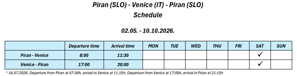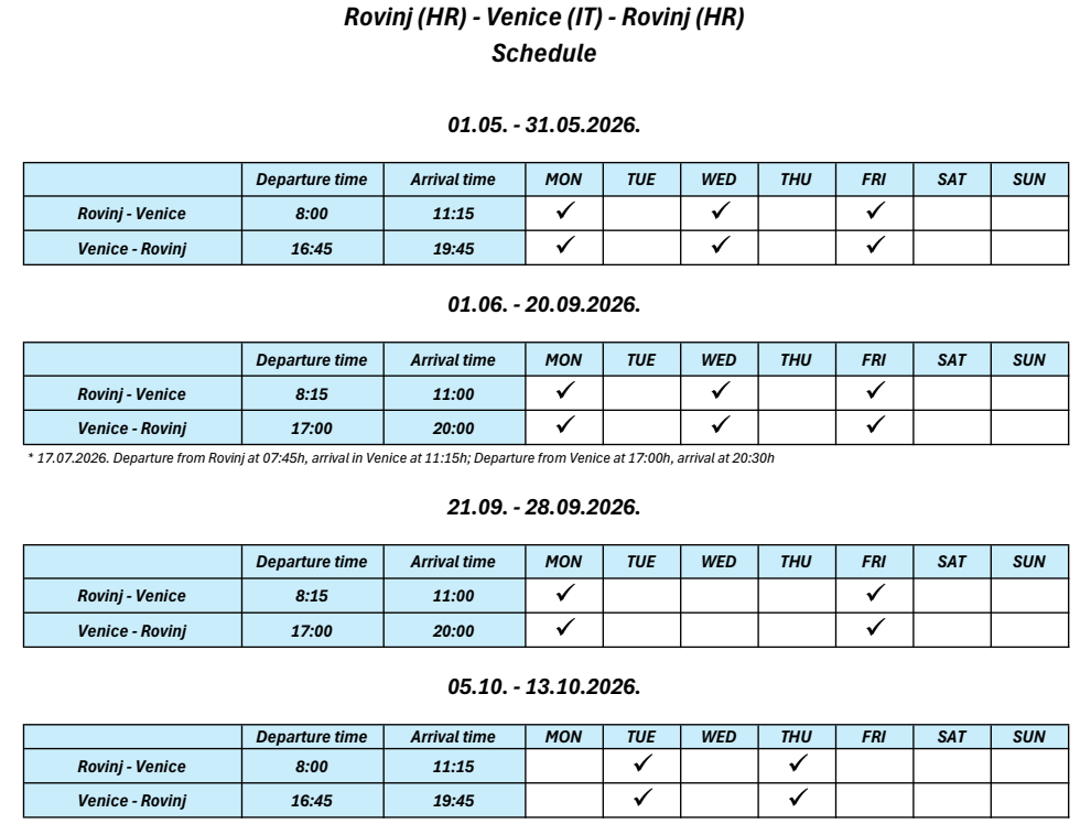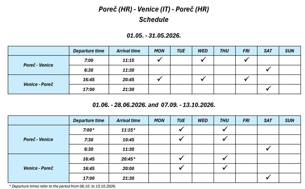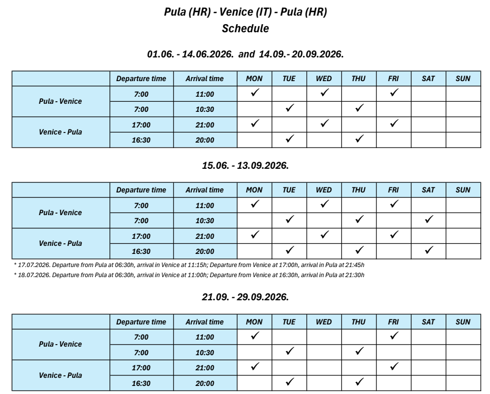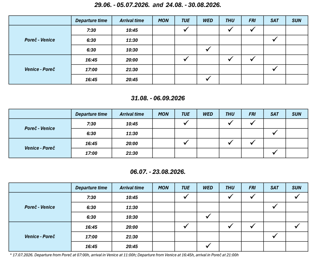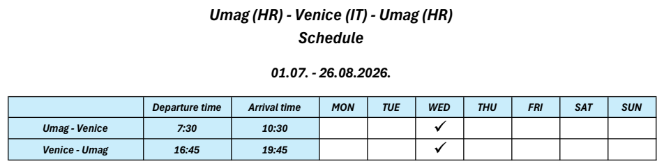 Fast ferry connections from Croatian ports to Venice offer a practical option for day trips to Venice and one-way travel. Choose your route below to view the full timetable.